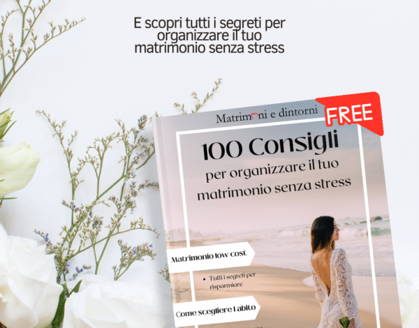 Scarica gratis la Guida “100 Consigli per organizzare il tuo matrimonio senza stress” Organizzare un matrimonio può essere un’esperienza meravigliosa… o un vero incubo ...